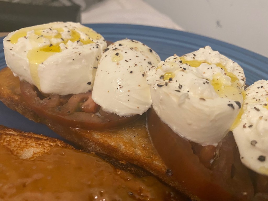 - Place one slice of bread fried-and-carameled-side-up. Add the tomato slices, then burrata slices. Drizzle with olive oil and pepper.