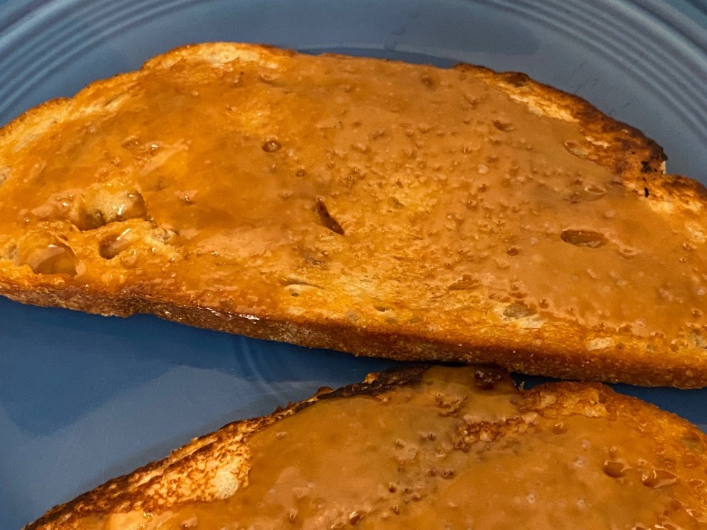 - Allow the caramel to cool just a little, until it is at a thick, spreadable consistency. Spread it onto the toasted side of the bread (as you would any other condiment).